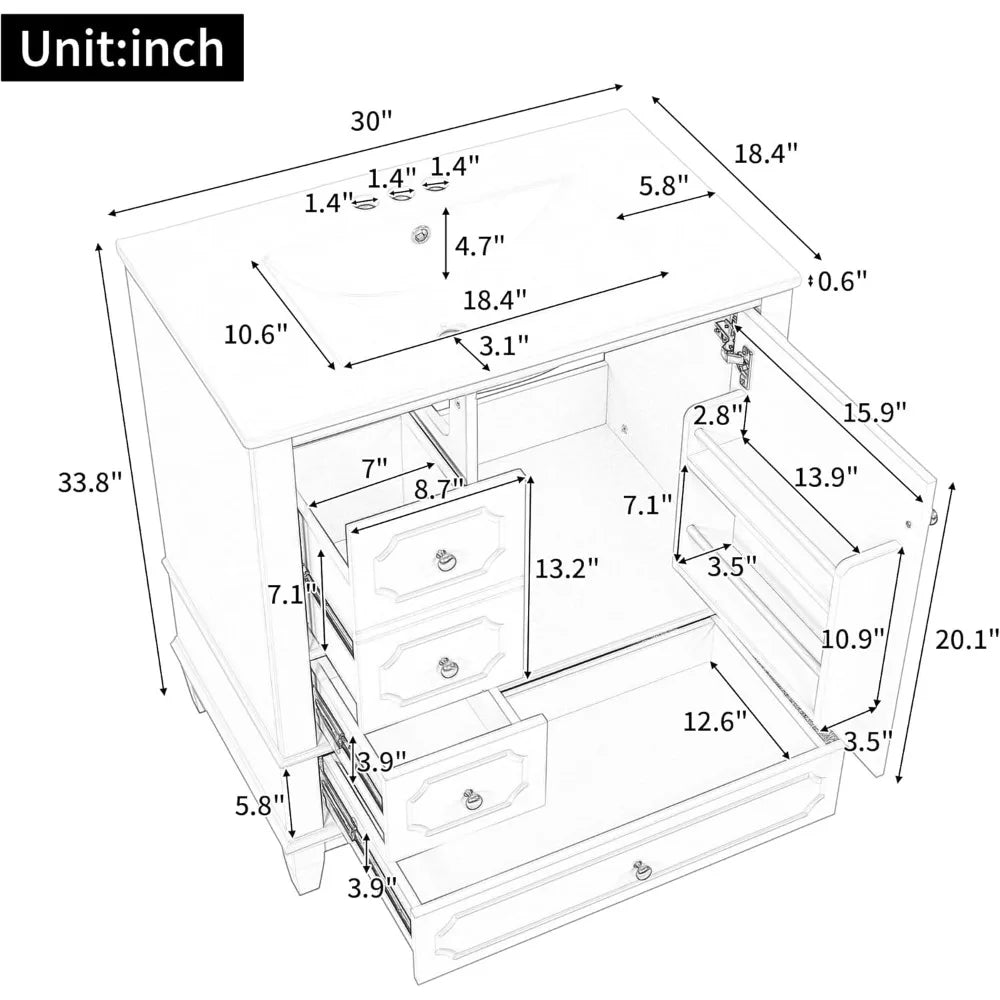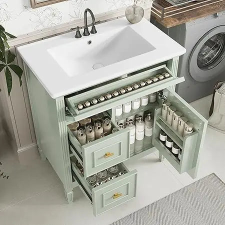 - 【Bathroom Cabinet with Drawers & Smart Storage Design】Stay organized with this Bathroom Cabinet with Drawers that includes two upper drawers, one deep bottom drawer, and a side cabinet with internal shelves and door racks. This 30 inch bathroom vanity with sink gives you the functional space to neatly store toiletries, towels, and more.